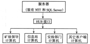 系統(tǒng)采用基于網(wǎng)絡(luò)的傳輸方式。從礦級(jí)領(lǐng)導(dǎo)、科室干部到管理人員都可通過網(wǎng)絡(luò)進(jìn)行信息傳輸。因此,利用本系統(tǒng)結(jié)合煤礦的網(wǎng)絡(luò)硬件資源條件,實(shí)現(xiàn)煤礦安全信息的錄入、查詢、修改、瀏覽和刪除等系統(tǒng)的硬件組成如圖2所示。
