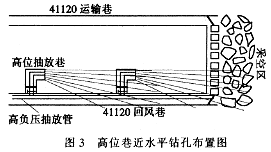 ????高位瓦斯抽放巷在41120回風(fēng)巷內(nèi)開口,沿垂直回風(fēng)巷向采面內(nèi)側(cè)按設(shè)計(jì)仰角掘進(jìn)巷道,掘至距41120工作面頂板10m高度后,做一個(gè)打鉆平臺(tái),在平臺(tái)內(nèi)逆采面推進(jìn)方向施工直徑為Φ153mm的近水平抽放鉆孔,封孔后連接在抽放支管上,然后在高位抽放巷偏口構(gòu)筑密閉墻,采用2BEC50泵對(duì)41120工作面采空區(qū)頂板裂隙帶的瓦斯進(jìn)行抽放(與走向傾斜瓦斯抽放鉆場(chǎng)抽放管共享)。