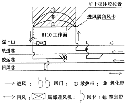 ?。?)封堵進(jìn)風(fēng)隅角,機(jī)頭處前10架進(jìn)行注膠,減少向采空區(qū)漏風(fēng),抑制采空區(qū)煤層自燃。綜放工作面開(kāi)始做拉架道時(shí),在進(jìn)風(fēng)隔角與支架尾部相齊做了1道風(fēng)卡(或臨時(shí)閉墻),并噴了快速密閉,同時(shí)對(duì)靠機(jī)頭側(cè)10架注膠封堵了與采空區(qū)的溝通。減少向采空區(qū)漏風(fēng),延緩煤層自然發(fā)火期。