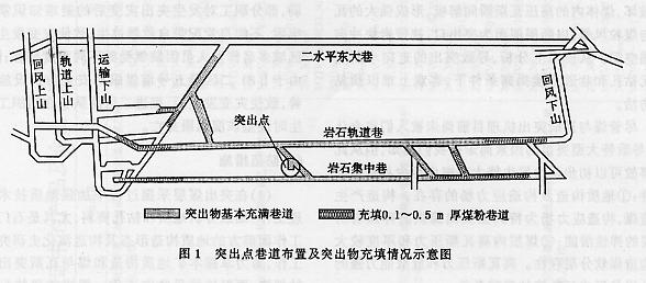 ??? 突出時煤層底板距工作面法線垂距達(dá)11.2 m,突出是以小斷層弱面帶為突破口的。據(jù)統(tǒng)計,這次突出煤巖量總計10 500 t,突出瓦斯量為938.2 km3;填堵全巷道總長度796 m,堆積煤厚超過200 mm以上巷道34m(見圖1);拋出50kg以上的巖塊達(dá)100多塊,其中重量超過5 t的有2塊:尺寸分別為2.15mX0.8mXl.35m和2.1mX0.8mXl.5?m.
