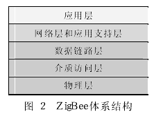 ZigBee體系結(jié)構(gòu)如圖2所示。其中物理層、介質(zhì)訪問層和數(shù)據(jù)鏈路層基于IEEE802.15.4無線個(gè)人局域網(wǎng)(WPAN)標(biāo)準(zhǔn)協(xié)議;ZigBee在IEEE802.15.4標(biāo)準(zhǔn)基礎(chǔ)之上建立網(wǎng)絡(luò)層和應(yīng)用支持層,包括巨大數(shù)量節(jié)點(diǎn)的處理最大節(jié)點(diǎn)數(shù)可以達(dá)到65000[3]個(gè))、ZigBee設(shè)備對(duì)象、用戶定義的應(yīng)用輪廓以及應(yīng)用支持層等。應(yīng)用層則由用戶根據(jù)需要進(jìn)行開發(fā)。