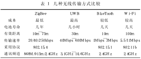 藍(lán)牙技術(shù)是愛立信、諾基亞以及IBM等公司在1998年率先推出,主要用于通信和信息設(shè)備的無線連接。Wi-Fi(無線高保真)是一種無線通信協(xié)議,主要目的是提供WLAN接入。ZigBee是由英國(guó)、美國(guó)、荷蘭以及日木一些著名的公司于2002年聯(lián)合推出的低成木、低功耗、短距離傳輸?shù)臒o線連接技術(shù)。UWB即超寬帶技術(shù)又被稱為脈沖無線發(fā)射技術(shù),是指占用帶寬大于中心頻率的1/4或帶寬大于15G無線發(fā)射方案,作為商用的無線通信技術(shù)。ZigBeeB1ueTeethUWB,Wi-Fi進(jìn)行性能比較[456]如表1所示。