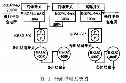 掘進(jìn)工作面在所裝備的局部通風(fēng)機(jī)供電以往采用一趟專用供電線路和一趟動(dòng)力供電線路雙回路供電方式,由于動(dòng)力線路負(fù)荷多,容易造成跳閘斷電等原因,安全供電不能得到保證,升級后專、備用風(fēng)機(jī)采用兩趟來自中央變電所的分開專用線路雙回路供電,供電安全系數(shù)大大提高。升級技術(shù)方案見圖 1。