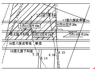 根據(jù)發(fā)生沖擊礦壓的地點(diǎn)所處位置初步分析,在南二下延采區(qū)17層七面下料道,上方為2005年末回采完畢的16層八面所遺留的煤柱,且屬于孤島煤柱,煤柱集中壓力大;該條巷道上幫又處在17層六面采空區(qū)保護(hù)煤柱內(nèi),煤柱集中壓力也相當(dāng)大,該條巷道正處于此煤柱壓力增高區(qū)下。由于16層老頂均為砂巖,強(qiáng)度比較大,所以,老頂在16層八面的懸頂面積比較大,由16層八面遺留煤柱向17層六面采空區(qū)保護(hù)煤柱和17層七面下料道頂板傳遞壓力增大,且在17層六面采空區(qū)保護(hù)煤柱里造成應(yīng)力疊加,導(dǎo)致該煤柱所承受的壓力積聚增加,進(jìn)而在17層七面下料道上幫出現(xiàn)礦山壓力增大。又因?yàn)?6、17層之間的巖性均為砂巖,強(qiáng)度比較大,所以造成17層七面下料道上幫礦山壓力增大,上幫發(fā)生彈性變形。而東榮二礦在巷修時(shí),采用了打木貼幫柱的支護(hù)方式,木支護(hù)屬剛性支護(hù),木貼幫柱嚴(yán)重限制了巷道上幫的彈性變形,這就為形成沖擊礦壓創(chuàng)造了動(dòng)力條件。