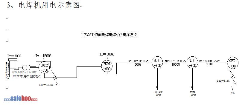 5、電焊機的電源660V,焊機電源從機巷JM-14絞車開關搭火。電纜和開關必須完好,嚴禁有明接頭或失爆現(xiàn)象,電焊機必須安排專人停送電。