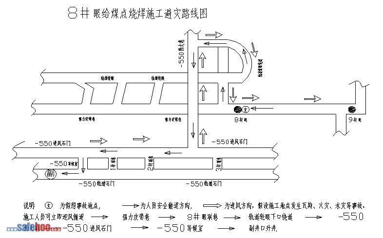 ??????? 六、避災(zāi)路線:假設(shè)施工地點發(fā)生瓦斯、火災(zāi)、水災(zāi)等事故,施工人員應(yīng)立即戴上自救器,按圖中箭頭所指方向迎風(fēng)向上進(jìn)入 → 強(qiáng)力皮帶8#眼聯(lián)巷 → 軌道輪眼下口繞道 →? -550西大巷? →? -550進(jìn)風(fēng)石門 → -550等候室? →? 副井 → 升井。