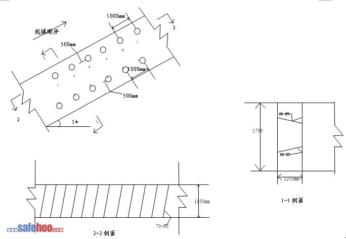 3)、采用毫秒微差爆破,人工串聯(lián),放炮器放炮,起爆順序由上向下,由頂眼“3、4、5”和底眼“1、2、3”炮為一組,每次放炮不得超過3組;