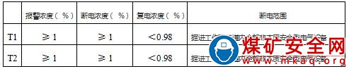 6.掘進(jìn)迎頭必須安設(shè)甲烷傳感器T1,回風(fēng)流距風(fēng)流交岔點(diǎn)10-15m處必須安設(shè)甲烷傳感器T2。T1、 T2的參數(shù)設(shè)置如下表所示: