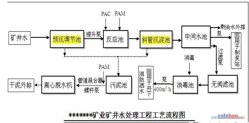 污水處理工藝流程 礦井水原水由井下提升泵直接打到預(yù)沉調(diào)節(jié)池中,廢水在預(yù)沉調(diào)節(jié)池中停留,調(diào)節(jié)水質(zhì)水量。廢水在停留的過(guò)程中,水中的懸浮物得到初步沉降,煤泥沉積于池底。調(diào)節(jié)池池底設(shè)計(jì)為斜面,進(jìn)水方向端設(shè)有泥斗,通過(guò)池中設(shè)置的行車(chē)式刮泥機(jī)將煤泥刮到泥斗中,再通過(guò)排泥泵打到污泥池。調(diào)節(jié)池出水通過(guò)水泵打到反應(yīng)池中,為了增強(qiáng)沉淀處理效果,在反應(yīng)池中投加混凝劑、助凝劑,通過(guò)池中的攪拌機(jī)攪動(dòng)、混合使廢水中的懸浮物與藥劑形成礬花,后進(jìn)入斜管沉淀池中。廢水在斜管沉淀池中進(jìn)一步沉降去除水中的懸浮物,出水進(jìn)入中間水池。沉淀分離的污泥沉積于池底泥斗中,通過(guò)控制排泥閥定期排入污泥池中。中間水池中的水通過(guò)兩組水泵分別送至制漿站直接回用,另一部分送至無(wú)閥濾池中進(jìn)行過(guò)濾處理,中間水池剩余的水外排。無(wú)閥濾池出水進(jìn)入消毒池,在消毒池入水口投加二氧化氯消毒,使處理后的水中維持一定的余氯量,防止供水系統(tǒng)中細(xì)菌的滋生。消毒后的水再通過(guò)回用水泵送至用水點(diǎn)回用。