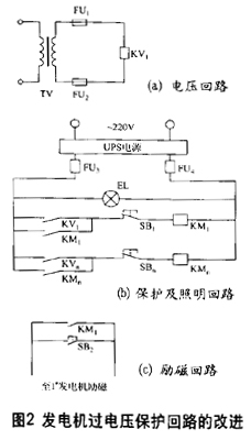 如圖2所示,在發(fā)電機(jī)出口電壓互感器二次側(cè)裝設(shè)電壓繼電器KV1見圖2(a),整定值為發(fā)電機(jī)額定電壓的1.25~1.3倍。當(dāng)發(fā)電機(jī)出口電壓達(dá)到整定值時(shí),其KV1的動(dòng)合觸點(diǎn)接通,使中間繼電器KM1線圈勵(lì)磁并自保持見圖2(b),若一個(gè)電站有多臺(tái)機(jī)組,則采用圖中并聯(lián)接法。同時(shí),KM1的另一動(dòng)合觸點(diǎn)也接通,見圖2(c),使發(fā)電機(jī)滅磁。這樣,發(fā)電機(jī)不會(huì)出現(xiàn)空載過電壓的現(xiàn)象,KM1的設(shè)置是為了防止發(fā)電機(jī)轉(zhuǎn)子磁場的"慣性"作用,確保發(fā)電機(jī)有效滅磁,發(fā)電機(jī)在下一次起勵(lì)前必須按復(fù)位按鈕SB1,再進(jìn)行其它正常操作。其它機(jī)組KM的接法同KM1。發(fā)電機(jī)滅磁后,則發(fā)電機(jī)出口沒有電壓,此時(shí),事故照明電源由UPS提供。