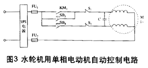 單相交流電動(dòng)機(jī)經(jīng)減速器來控制水輪機(jī)的操作手柄,水輪機(jī)的轉(zhuǎn)速控制及有功負(fù)荷控制由電動(dòng)機(jī)來完成。當(dāng)開機(jī)或增大有功負(fù)荷時(shí),按下SB3;當(dāng)關(guān)機(jī)或減有功負(fù)荷時(shí),按下SB4。若機(jī)組滿負(fù)荷運(yùn)行,此時(shí)當(dāng)出現(xiàn)外線路故障或大電網(wǎng)停電時(shí),由中間繼電器KM1的動(dòng)合觸點(diǎn)使電動(dòng)機(jī)運(yùn)轉(zhuǎn)見圖3,經(jīng)減速器使水輪機(jī)的導(dǎo)水機(jī)構(gòu)自動(dòng)關(guān)閉,此時(shí)位置開關(guān)S1斷開,電動(dòng)機(jī)停止運(yùn)轉(zhuǎn),自動(dòng)過程結(jié)束。S2安裝在水輪機(jī)導(dǎo)水機(jī)構(gòu)100%時(shí)對應(yīng)的碰桿位置。當(dāng)外線故障或大電網(wǎng)停電時(shí),由中間繼電器KM1的動(dòng)合觸點(diǎn)使電動(dòng)機(jī)運(yùn)轉(zhuǎn),經(jīng)減速器使水輪機(jī)的導(dǎo)水機(jī)構(gòu)自動(dòng)關(guān)閉,防止了機(jī)組"飛車"事故的發(fā)生。