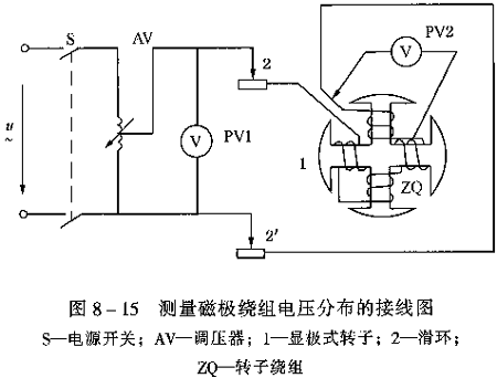 e.對于顯極式轉(zhuǎn)子一般僅要求在膛外測量,除測量整個(gè)轉(zhuǎn)子繞組的交流阻抗和功率損耗外,還應(yīng)在相同的電流條件下測量各磁極繞組的電壓,試驗(yàn)電路如圖8—15所示。