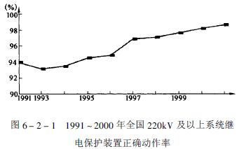各網(wǎng)、省局認(rèn)真貫徹執(zhí)行1994年8月電力部在天津召開的繼電保護工作會議精神及關(guān)于開展繼電保護管理年工作的文件規(guī)定,取得了顯著成績,220KV及以上系統(tǒng)繼電保護正確動作率從1994年的94.55%上升到2000年的98.78%,完成了繼電保護管理年確定的95.5%目標(biāo),同時也達(dá)到了2000年96.5%的目標(biāo)。幾年來,繼電保護正確動作率情況見圖6-2-1。