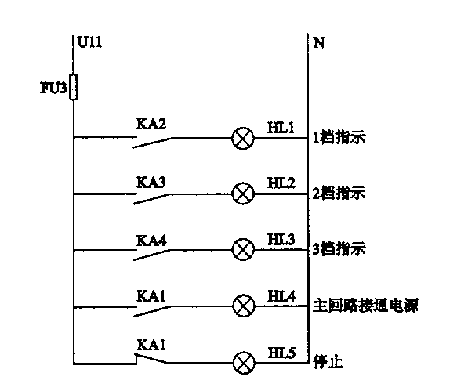 其次對控制電路進(jìn)行設(shè)計(jì)改造。因原電路更換檔位由人工操作分接開關(guān)完成,現(xiàn)在主電路中取消了分接開關(guān),改用了電氣控制,因此控制電路必須設(shè)計(jì)成1檔、2檔、3檔分別控制,這里我們考慮用一只十字開關(guān)來預(yù)選所需檔位,當(dāng)然也可以采有三只按鈕操作。各檔之間采用電氣互鎖,保證主電路中只有一個(gè)檔位的接觸器吸合。改造后的控制電路接線如圖2b所示。