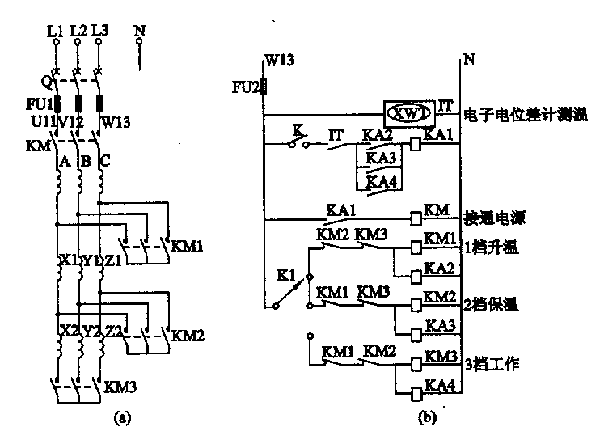 接線完成后,為考慮人身和設(shè)備的安全,可以在不接通電源接觸器KM的情況下(只須將電子電位差計(jì)的電源斷開),進(jìn)行檔位操作,觀察主電路中各接觸器吸合情況是否符合要求。然后把電子電位差計(jì)的電源接上,看各檔定溫后能否準(zhǔn)確控溫:即到設(shè)定溫度,斷開選定檔位的接觸器;低于設(shè)定溫度,選定檔位的接觸器自動(dòng)吸合進(jìn)行升溫。
