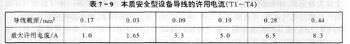 本質(zhì)安全型設(shè)備導(dǎo)線的許用電流可參考表7—9所列數(shù)據(jù)。除特殊情況外,該型設(shè)備及其關(guān)聯(lián)設(shè)備外殼防護(hù)等級不得低于IP20,煤礦井下采掘工作面的不得低于IP54。其外部連接可以采用接線端子與接線盒或采用插接件,接線端子之間、接線端子與外殼之間均應(yīng)有足夠的距離,插接件應(yīng)有防止拉脫的措施。