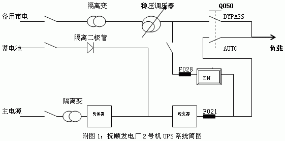 撫順發(fā)電廠2號(hào)機(jī)為2002年6月投產(chǎn)的200MW采暖、凝汽兩用式汽輪發(fā)電機(jī)組。其單元220V不間斷電源系統(tǒng)選用由美國GUTOR公司生產(chǎn),青島整流器廠經(jīng)銷的PEW1000型UPS系統(tǒng);該系統(tǒng)只供重要的調(diào)節(jié)、控制、保護(hù)儀表監(jiān)測和重要信號(hào)電源,不做一般負(fù)荷電源。