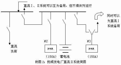 在與廠家聯(lián)系更換UPS主控板后切主回路運(yùn)行,發(fā)現(xiàn)2號充電機(jī)直流輸出電流升至78A左右(原來主回路運(yùn)行時10A左右);Ⅱ組蓄電池充放電電流表指示為0,直流母線電壓為230V;經(jīng)檢查蓄電池及直流隔離二極管均運(yùn)行正常,隨后停止2號充電機(jī)運(yùn)行,Ⅱ組蓄電池放電電流為12A,又因為此時,3號充電機(jī)空載運(yùn)行時輸出電壓擺動大,所以再次啟動2號充電機(jī)維持UPS系統(tǒng)運(yùn)行(附圖2為2號機(jī)直流系統(tǒng)運(yùn)行方式簡圖)。