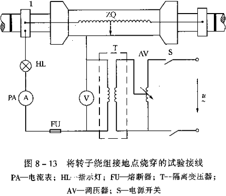 如需將轉(zhuǎn)子繞組較高的接地電阻通過燒穿試驗變成較低的穩(wěn)定接地電阻,可按圖8—13所示試驗接線進行。圖中:電流表PA用作監(jiān)視燒穿接地點電流;燈泡HL用作限流和在燒穿時發(fā)亮信號;熔斷器FU用作保護,以免電流持續(xù)時間過長,燒壞轉(zhuǎn)子部件。