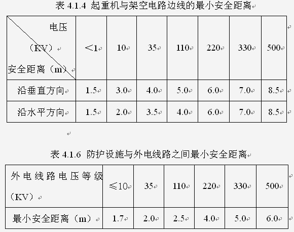 其實,《施工現場臨時用電安全技術規(guī)范》(JGJ46-88)對起重機與架空電路邊線的最小安全距離的規(guī)定,比《施工現場臨時用電安全技術規(guī)范》(JGJ46-2005)更合乎邏輯性?!妒┕がF場臨時用電安全技術規(guī)范》(JGJ46-88)第3.1.4條規(guī)定:旋轉臂架式起重機的任何部位或被吊物邊緣與10KV以下的架空線最小水平距離不得小于2m。言簡意賅,而且符合最小安全距離>防護設施。