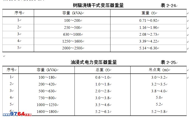 ??? 3.1.1? 變壓器二次搬運(yùn)應(yīng)由起重工作業(yè),電工配合。最好采用汽車吊吊裝,也可采用吊鏈吊裝,距離較長最好用汽車運(yùn)輸,運(yùn)輸時(shí)必須用鋼絲繩固定牢固,并應(yīng)行車平穩(wěn),盡量減少震動;距離較短且道路良好時(shí),可用卷揚(yáng)機(jī)、滾杠運(yùn)輸。變壓器重量及吊裝點(diǎn)高度可參照表2-24及表2-25。