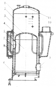 立式彎水管鍋爐已經(jīng)系列化,蒸發(fā)量有0.2~1.5t/h數(shù)種,蒸汽參數(shù)為5~8at<sub>表壓<sub>,飽和溫度;每t/h蒸發(fā)量耗用金屬約4~6t。