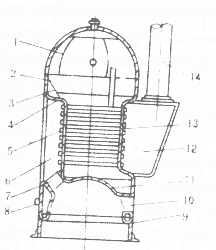 1―封頭 2―筒身 3―拉撐 4―后管板 5―火管 6―后煙箱 7―喉管 8―手孔 9―下腳圈 10―爐門 11―爐膽 12―前煙箱 13―前管板 14―煙囪