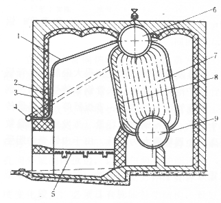 1―水冷壁厚 2―爐墻 3―下降管 4―聯(lián)箱 5―爐排 6―上鍋筒 7―對流管束 8―隔火墻 9―下鍋筒