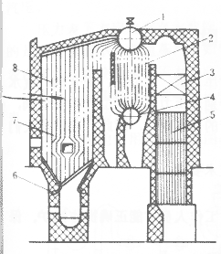 1―上鍋筒 2―對流管束 3―省煤器 4―下鍋筒 5―空氣預(yù)熱器 6―聯(lián)箱 7―爐膛 8―水冷壁