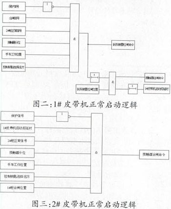 1.1啟動時,2#皮帶機要晚于1#皮帶機3秒鐘啟動,其流程實現(xiàn),依靠PLC裝置向1#皮帶機上口MCC饋線柜(以下簡稱1#柜),發(fā)出合閘指令,1#柜中的保護模塊首先使該段皮帶的剎車裝置松閘,然后合入本柜接觸器,并同時開始計時,當(dāng)計時時間達到三秒時,2#皮帶機上口MCC饋線柜(以下簡稱2#柜)獲得延時完畢,合入該柜接觸器,完成送電流程。(圖二、圖三分別為1#皮帶機、2#皮帶機正常啟動邏輯)