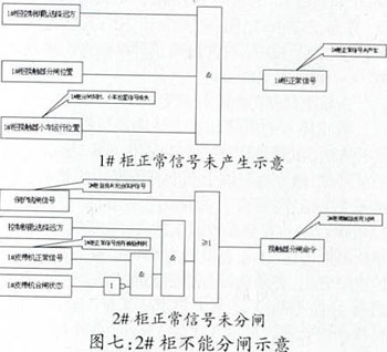 而從2#柜的分閘邏輯還可以看出,只有在1#柜接觸器分閘位置及正常信號,同時被2#柜保護裝置檢測到的時候,2#柜才能正確分閘。因此,在1#柜小車位置信號消失、2#柜自身又沒有保護信號的情況下,2#柜接觸器是無法分閘的。(見圖七)
