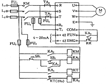 實(shí)際應(yīng)用中,有許多控制方案設(shè)置外圍電路控制電源側(cè)接觸器實(shí)現(xiàn)系統(tǒng)軟起動特性,圖?2是某雜志一篇文章推薦的日產(chǎn)三墾(SANKEK)變頻器的控制方案。由圖可知,該方案電動機(jī)起動時按SB2,其觸點(diǎn)閉合,KA1得電,其動合觸點(diǎn)分別發(fā)出變頻器運(yùn)行和時間繼電器KT的激勵命令,KT延時斷開動合觸點(diǎn)提供繼電器KA2激勵命令,KA2動合觸點(diǎn)控制KM吸合,變頻器得電起動電動機(jī)。