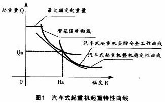 汽車式起重機(jī)整機(jī)穩(wěn)定性曲線是在各個(gè)工作幅度情況下,對(duì)于給定的安全系數(shù)而汽車式起重機(jī)不會(huì)發(fā)生傾翻的原則確定的。只要起重量低于這條曲線,汽車式起重機(jī)穩(wěn)定性是安全的。可以看出,在臂架強(qiáng)度曲線和汽車式起重機(jī)整機(jī)穩(wěn)定曲線的交點(diǎn)a所確定的起重量為Qa和工作幅度為Ra,起重機(jī)工作幅度小于Ra時(shí),由于汽車式起重機(jī)穩(wěn)定性決定的起重量大于臂架強(qiáng)度決定的起重量,因此,工作幅度小于Ra時(shí)起重量是由臂架強(qiáng)度確定的;