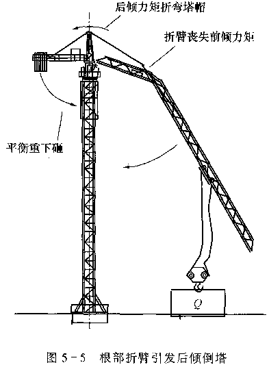 (4)斜拉、側(cè)拉起吊重物。不知道斜拉、側(cè)拉會(huì)使吊臂產(chǎn)生很大的橫向彎矩,吊臂下弦桿很容易局部屈曲,從而發(fā)生折臂。根部折臂會(huì)失去前傾力矩,引起平衡重后傾往下砸,打壞塔身而倒塔(見(jiàn)圖5—5)。