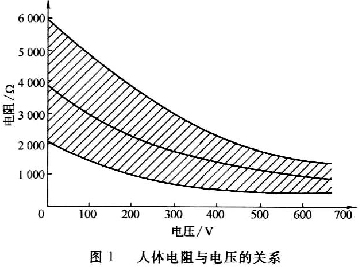 通過人體電流的大小,取決于人體接觸帶電體的電壓及人體的接觸電阻。安全電壓是指確保通過人體的電流不超過安全電流的電壓極限值。當(dāng)人體處于水中,尤其是處于海水中時(shí),人體的接觸電阻明顯下降,所能承受的安全電壓也就降低。另外,人體的電阻也受所接觸的電壓本身的影響。隨著接觸電壓的增大,人體電阻逐漸降低,如圖所示。