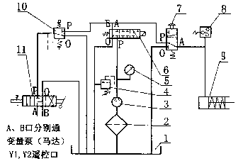 為克服上述兩種方式的不足,山東金嶺鐵礦在廣泛收集和研究國(guó)外先進(jìn)技術(shù)的同時(shí),結(jié)合國(guó)內(nèi)液壓技術(shù)水平,設(shè)計(jì)了一套機(jī)、電、液一體化的液壓伺服控制系統(tǒng)。它以液控變量泵和馬達(dá)為基礎(chǔ)組成靜液壓驅(qū)動(dòng)系統(tǒng),通過(guò)控制先導(dǎo)閥改變液壓泵(馬達(dá))液控?fù)Q向閥上兩液控油口的壓差來(lái)實(shí)現(xiàn)靜液壓驅(qū)動(dòng)系統(tǒng)的無(wú)級(jí)變速。這種方式以液壓油為工作介質(zhì),工作油路全封閉,因而具有不怕潮濕、抗沖擊、耐震動(dòng)等特點(diǎn)。同時(shí),采用彈簧制動(dòng)、液壓松閘全封閉油冷濕式多盤制動(dòng)器,可將液壓伺服控制和制動(dòng)油路設(shè)計(jì)成同一液壓回路(如圖)來(lái)實(shí)現(xiàn)靜液壓驅(qū)動(dòng)系統(tǒng)與制動(dòng)系統(tǒng)的聯(lián)動(dòng)?!?/p>