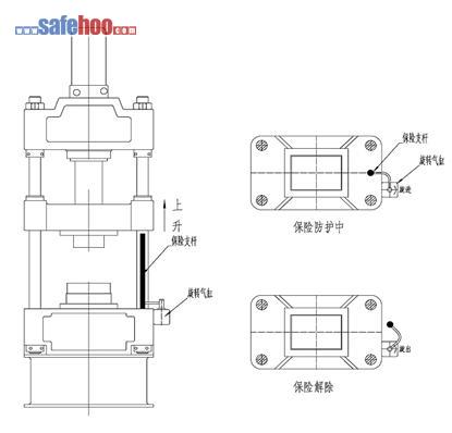 現(xiàn)代化工廠中全部依靠設(shè)備來完成產(chǎn)品,但是,在生產(chǎn)過程中,由于設(shè)備設(shè)計安全性缺陷引發(fā)的安全事故會有發(fā)生,對操作人員造成很嚴重的威脅。在我司壓制工位,有20臺100噸液壓機,用來將粉末料狀壓制成成型的料塊。大致步驟為油缸帶動滑塊上升到頂后,模具打開,操作人員在模具內(nèi)裝填粉料,填完后,滑塊下行進行壓制,粉末被壓成成型塊?;瑝K上行,模具再次打開,取出成型塊。在裝料和取料過程中,人的手部完全在壓機的滑塊下方。一旦液壓油路出現(xiàn)故障或者油缸桿斷裂,滑塊下落,操作人員的手將保不住。安全無小事,油缸桿去年曾斷裂過,是在油缸上升過程中發(fā)生的,人員在等待油缸升到頂后作業(yè),未造成人員傷害。此事故給我們敲響了警鐘,怎樣才能保證操作人員的人身安全呢?本人在多年的修理實踐中給壓機設(shè)計安裝了保險機構(gòu),收到了良好效果。