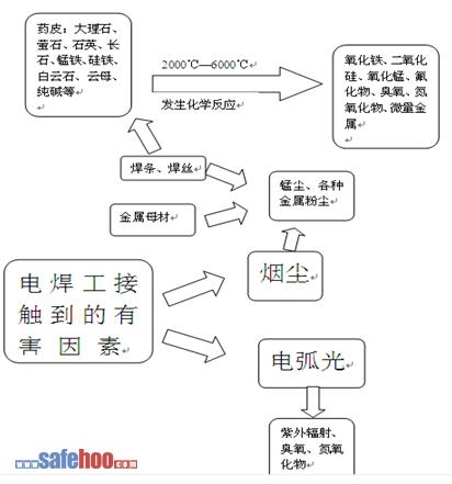 焊工的主要職業(yè)危害是粉塵、有毒氣體、高溫、電弧光、高頻磁場等。電焊工接觸到的有害因素示意如下圖1: