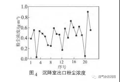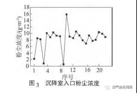現(xiàn)場(chǎng)進(jìn)行了燃燒沉降室進(jìn)出口粉塵濃度測(cè)試,以驗(yàn)證燃燒沉降室的沉降效率。測(cè)試粉塵濃度有2個(gè)測(cè)試點(diǎn),一個(gè)在燃燒沉降室前,入口彎煙道末端;另外一個(gè)在燃燒沉降室后,沉降室出口煙道,具體位置見(jiàn)圖2中D1、D2。