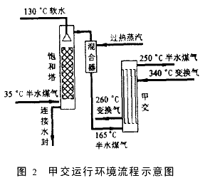 我廠合成氨采用加壓變換工藝,工作壓力1.2MPa,第一熱交換器(以下簡稱為甲交)前后的流程大致為:半水煤氣經由飽和塔與熱水直接接觸被加熱、加濕,然后僅通過混合器添加部分過熱蒸汽便直接進入甲交下封頭,再經管內與管間的熱變換氣間接換熱,流程中出飽和塔的被加熱、加濕的半水煤氣未經氣水分離。