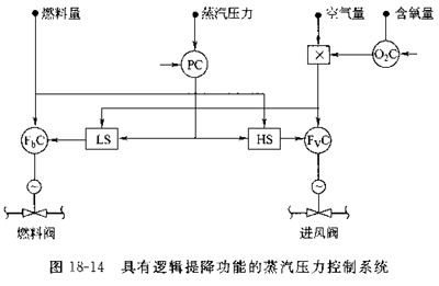 燃油鍋爐的情況與燃煤鍋爐有較大差異。對(duì)于現(xiàn)代大型燃油鍋爐,多采用微正壓燃燒。這樣可以減少漏風(fēng),實(shí)現(xiàn)低氧燃燒,從而防止鍋爐受熱面的腐蝕和污染等。由于低氧燃燒時(shí)過(guò)??諝庀禂?shù)很小,在負(fù)荷變動(dòng)時(shí)更應(yīng)注意燃料量與空氣量的配合恰當(dāng),否則會(huì)產(chǎn)生不完全燃燒,引起爐膛爆炸、受熱面污染、尾部再燃等事故。因此在鍋爐增減負(fù)荷時(shí)提出這樣的邏輯要求:增負(fù)荷時(shí)先增風(fēng)再增油;減負(fù)荷時(shí)先減油再減風(fēng)。具有邏輯提降功能的蒸汽壓力控制系統(tǒng)如圖18—14所示。圖中LS和HS分別為低、高值選擇器。