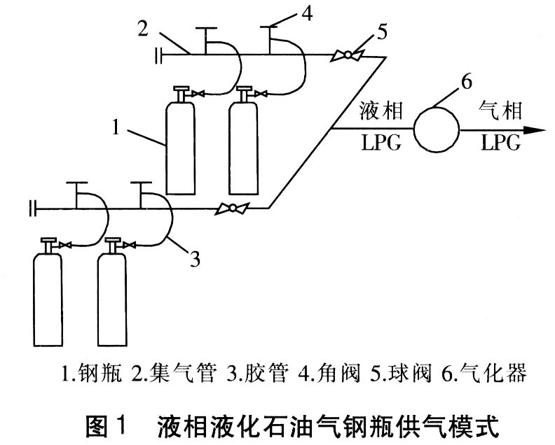 ??? 液相液化石油氣鋼瓶供氣模式為液相液化石油氣自鋼瓶通過膠管進(jìn)入集氣管,而后進(jìn)入氣化器進(jìn)行強(qiáng)制氣化后成為氣相液化石油氣,再通過管道供給用戶使用。供氣模式見圖1。