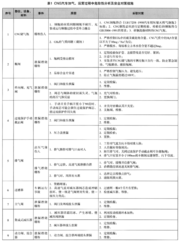 2.6 CNG汽車加氣、運(yùn)營過程中危險(xiǎn)性分析見表1。