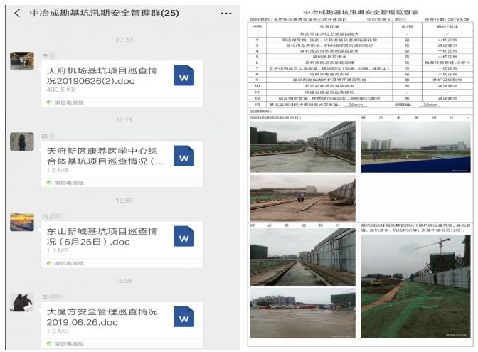公司總經(jīng)理、總工程師、分管安全的副總經(jīng)理對(duì)在建重點(diǎn)項(xiàng)目進(jìn)行帶班檢查10余次,針對(duì)近期國(guó)內(nèi)建設(shè)領(lǐng)域坍塌事故頻發(fā)的現(xiàn)象,在公司總經(jīng)理牽頭下,公司履約部門(mén)組成汛期專項(xiàng)檢查組,對(duì)公司所有在建深基坑共10個(gè)項(xiàng)目進(jìn)行“汛期深基坑專項(xiàng)安全檢查”,檢查組重點(diǎn)查看現(xiàn)場(chǎng)基坑防護(hù)、防汛物資準(zhǔn)備、防汛應(yīng)急防范預(yù)案等,要求項(xiàng)目部把方案落實(shí)到位,責(zé)任落實(shí)到人,加強(qiáng)巡查,一旦發(fā)現(xiàn)險(xiǎn)情,及時(shí)處置,確保在建工程安全。并建立了“中冶成勘基坑汛期安全管理群”,各項(xiàng)目部每天在群內(nèi)上報(bào)項(xiàng)目巡查情況。